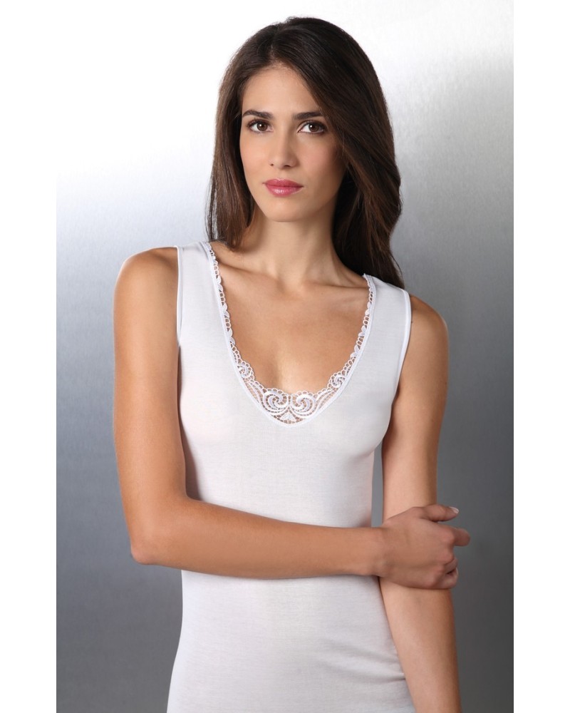 Canotta spalla larga in cotone di altissima qualità Filoscozia con ricamo macramè, bordata in raso elasticizzato. Nessuna cucitura laterale per il massimo del comfort.